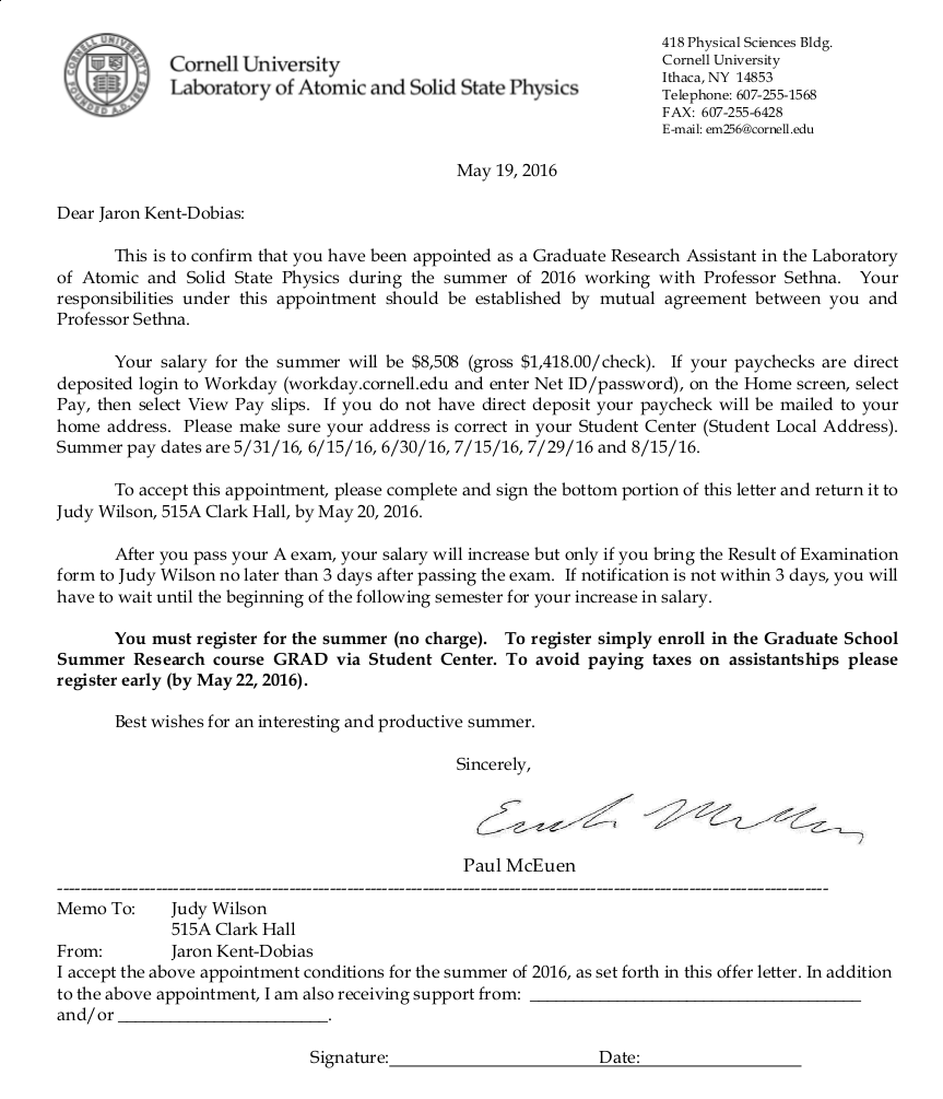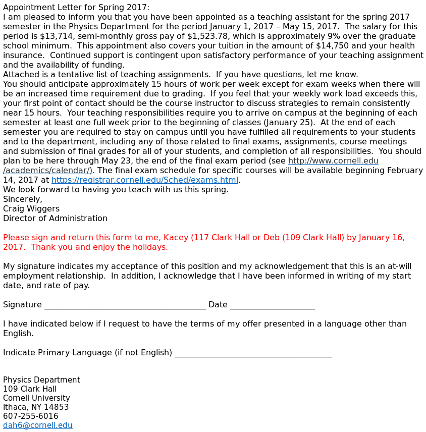 If you are a graduate worker at Cornell University, you can contribute to this project by emailing your appointment letters to data@gradwages.org. You should receive an appointment letter from your department for every semester you work as a TA, RA, or GRA. These letters can vary from poorly formatted emails to professional-looking email attachments, but contain